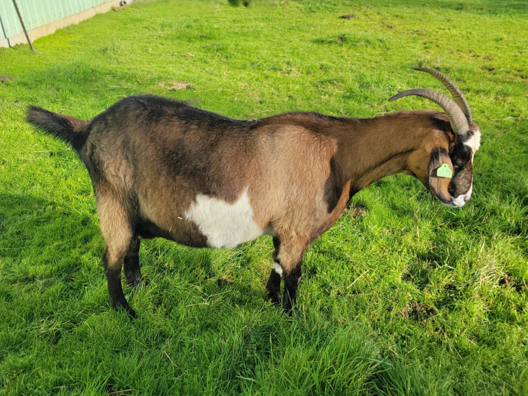 Moxi was a bottle baby that I acquired to keep one of my own bummers company. She's the class clown, has her nose in EVERYTHING and wins everyone over with her lovable personality. Moxi may not be kiko but she lives up to the kiko standard! She's got a beautiful, productive udder, solid hooves resistant to our PNW weather, isn't prone to parasite overload, has produced and raised top gaining triplets every kidding AND supplied enough milk to supplement 6 bottle babies in 2023 during that cold snap. My life has been blessed to have and know this ray of sunshine, and I cannot express how much I love this girl. Moxi has always had triplets until this year, in which she put everything she had into a single, red spotted chunk of a buckling, sired by Saffron 1/2/2025.