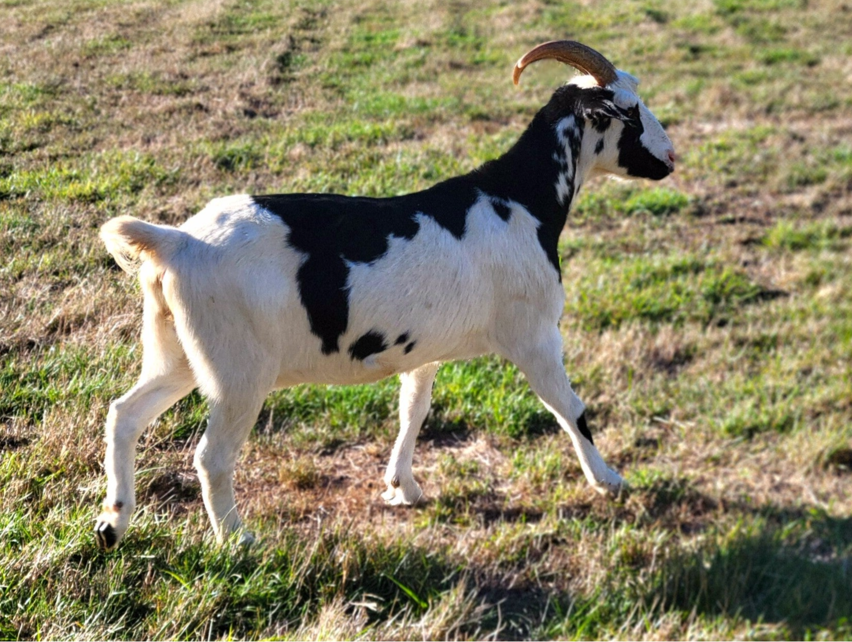 This doeling has all the elegance you could desire in a kiko doeling and her faint gray spots add just a touch of jazz! I'm thrilled with how Jazz is growing out; she's got lovely balance front to back and plenty of flesh over her rib and hip. Jazz is a prime candidate to cross under Brass Tacks in 2026 for '27 kids.